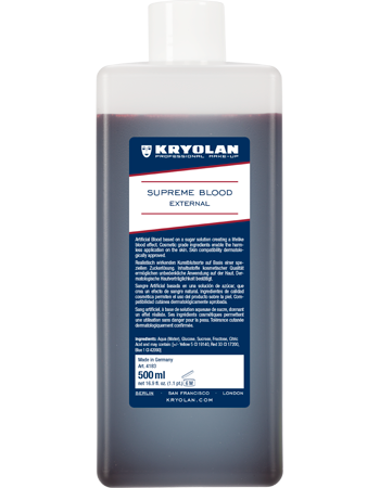 Supreme Blood External is Kryolan's latest blood development and in comparison to any other Kryolan bloods based on a sugar solution. Cosmetic grade ingredients enable the harmless application on the skin and the right mixture of water-soluble color pigments create a lifelike blood effect. Supreme Blood has a blood-like viscosity and very realistic flow velocity. Ideal for theatre, TV & Film, and any other special effects creations.